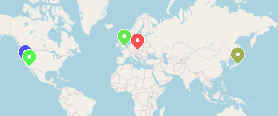 This is a screenshot of the map's output as of 2nd of march 2024 with the example posts in this repository. Note that each marker is given a specific color that range between red, green and blue. These color ranges expresses the difference between a future, present and past activity.